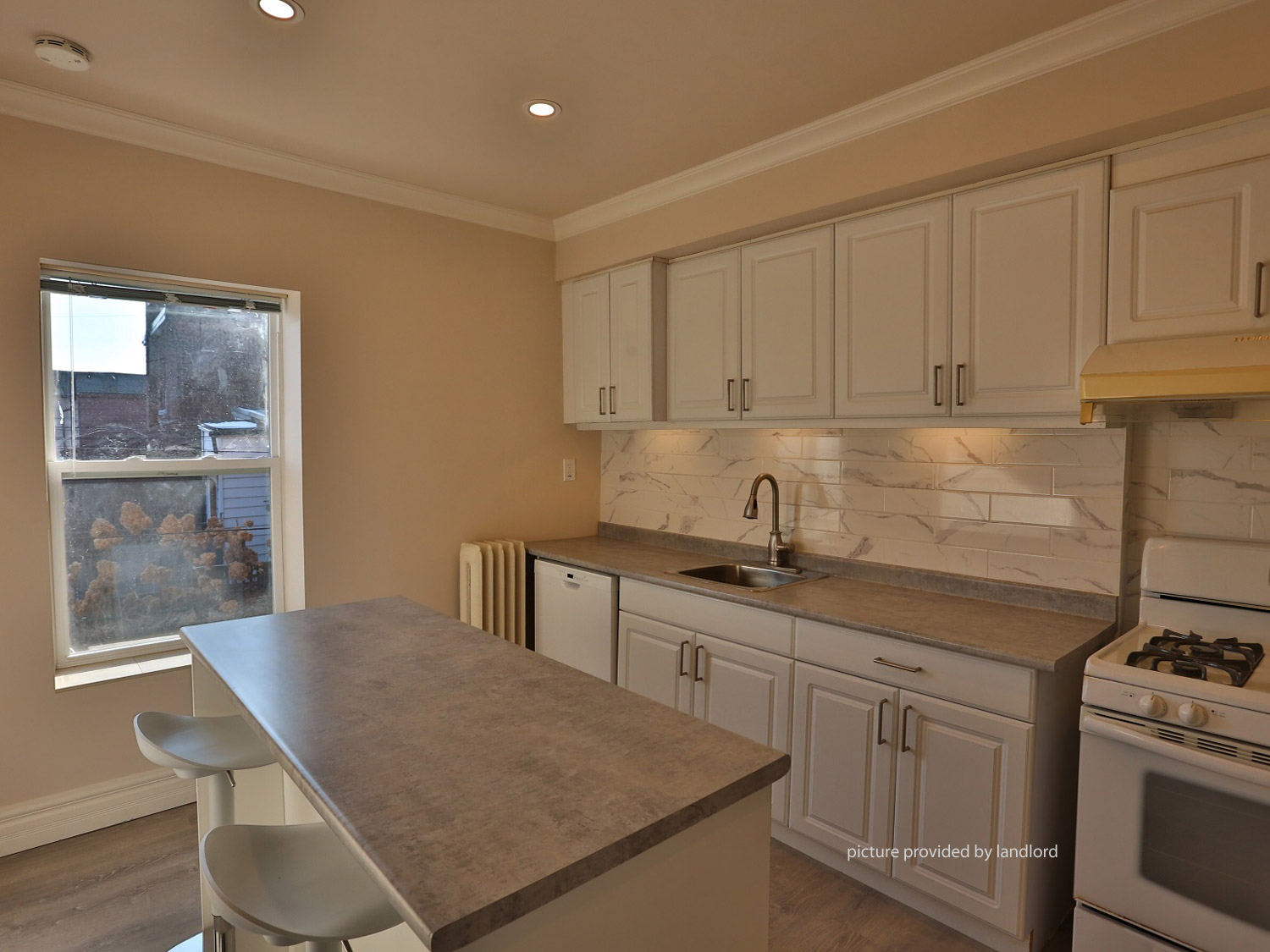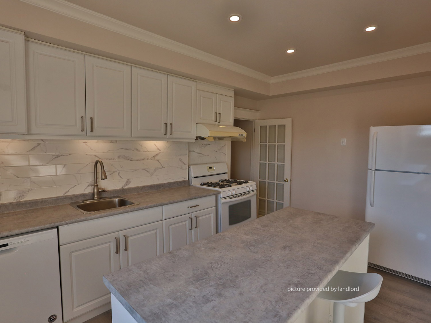 kitchen island with bar stools, 18cu-ft large fridge, gas stove/oven, stainless steel tall tub dishwasher, lot of cabinet storages.