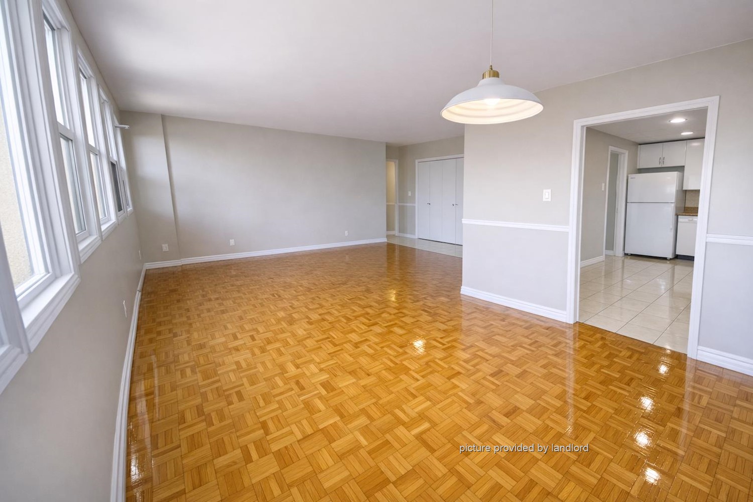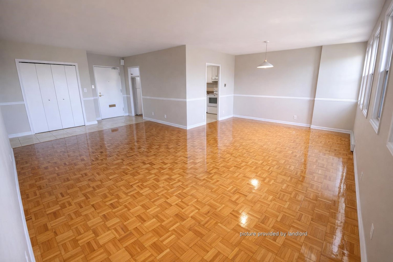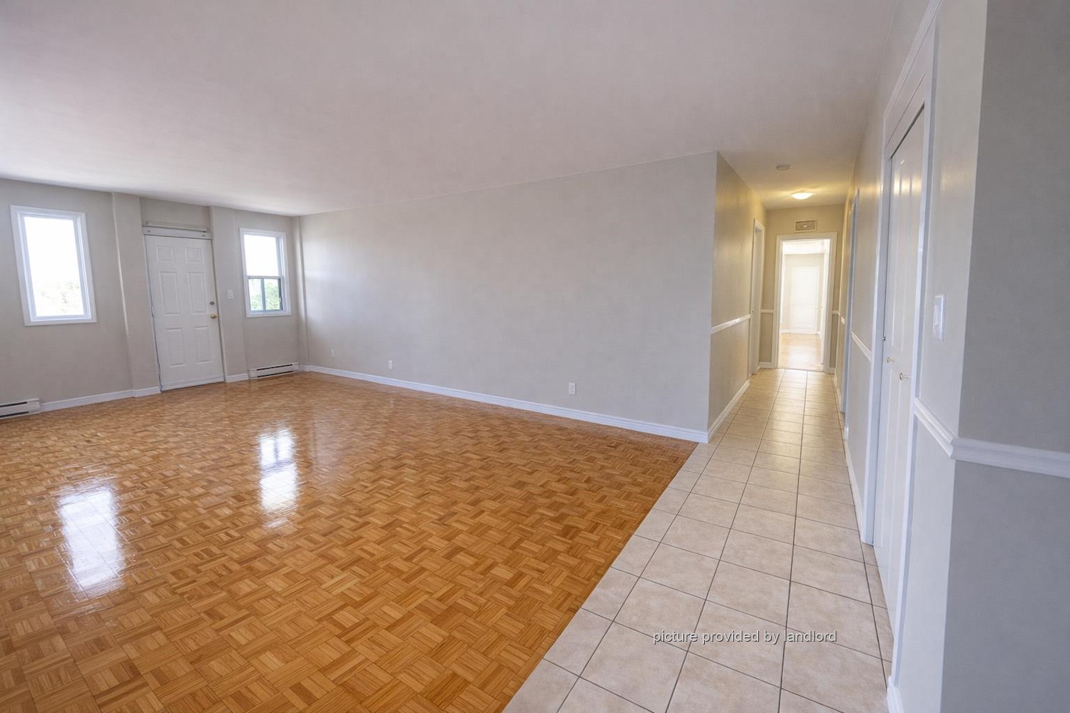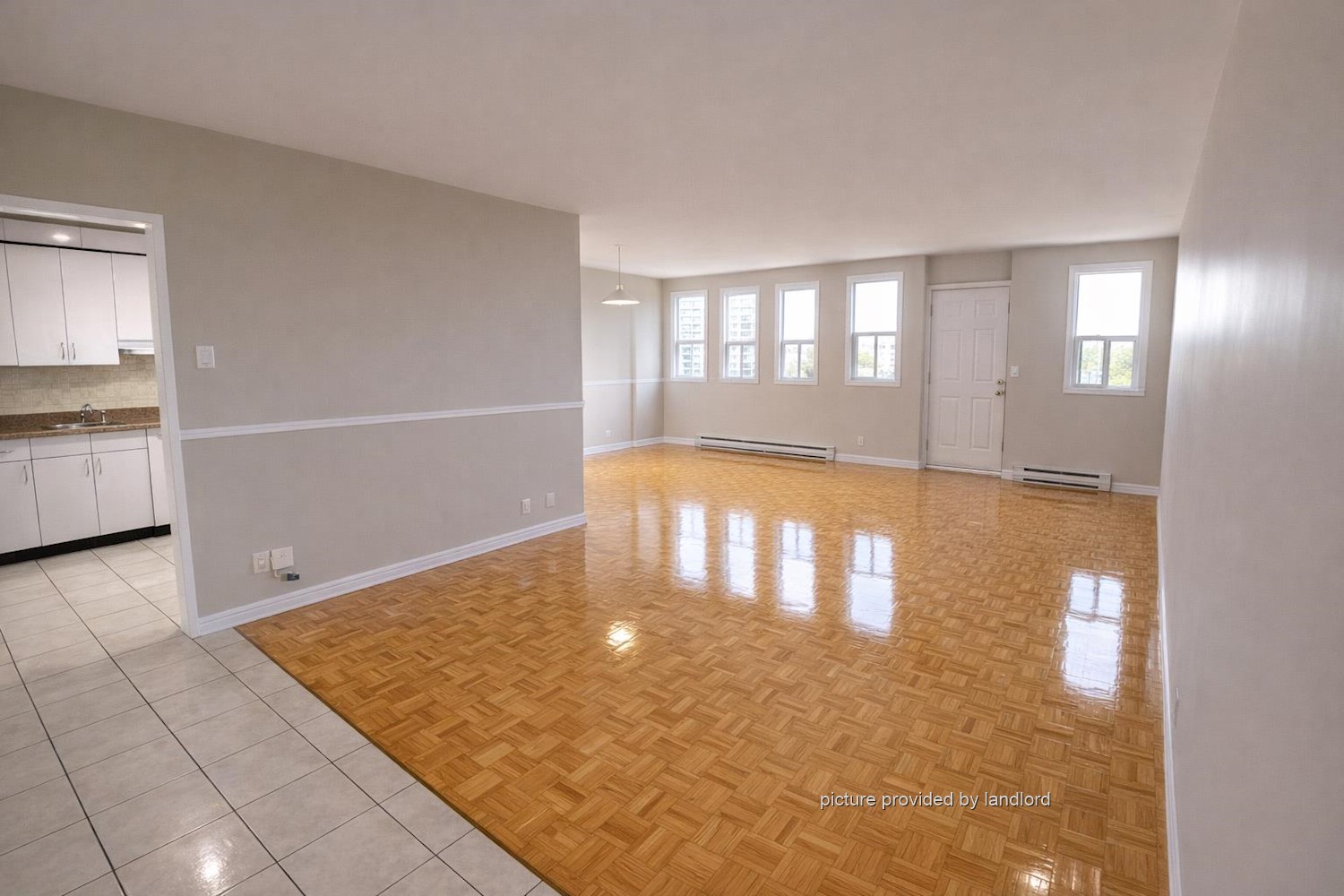parking, parquet floors in bright living space and ceramics in kitchen and