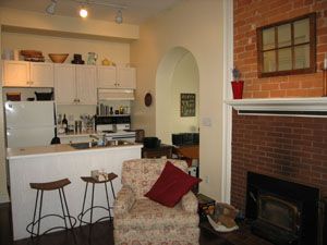 Dining, Den. Features Hardwood floors throughout, exposed brick fireplace,
