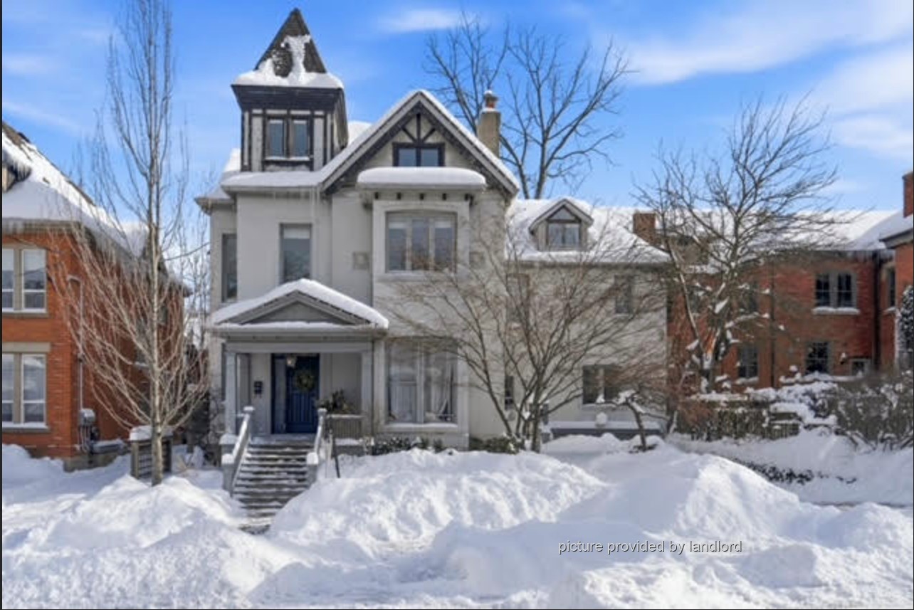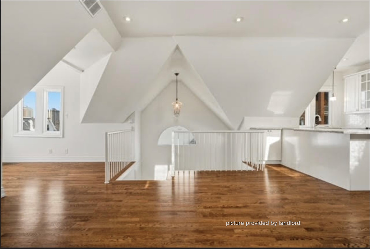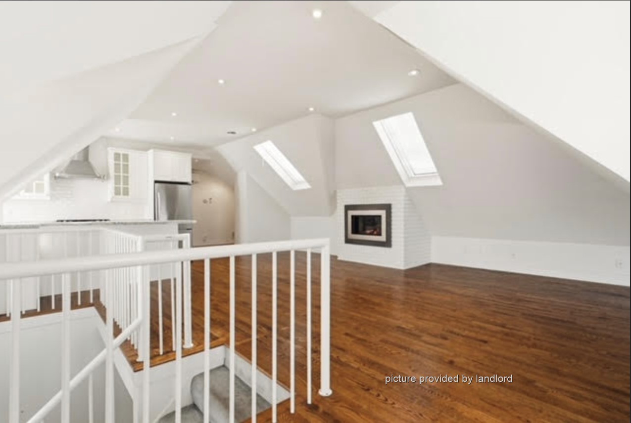 Gorgeous 2 bedroom one-of-a-kind unit in a century mansion. This loft is approximately 1800 square feet and oozes in character. The living room is bright with two sky lights and a gas fireplace. The dining room boasts a 12 foot high turret centered over the table. There are two spacious bedrooms - the master bedroom has two walk in closets and a large ensuite and the second bedroom has access to a small balcony. This loft has a quaint kitchen (including a dishwasher) with amazing views, a brand new spa-like powder room with its own sky light and private laundry facilities only used by the tenant in this unit. The home has a lovely entrance with black marble floors and a winding staircase. Walking distance to the GO train and St. Joseph's Hospital.