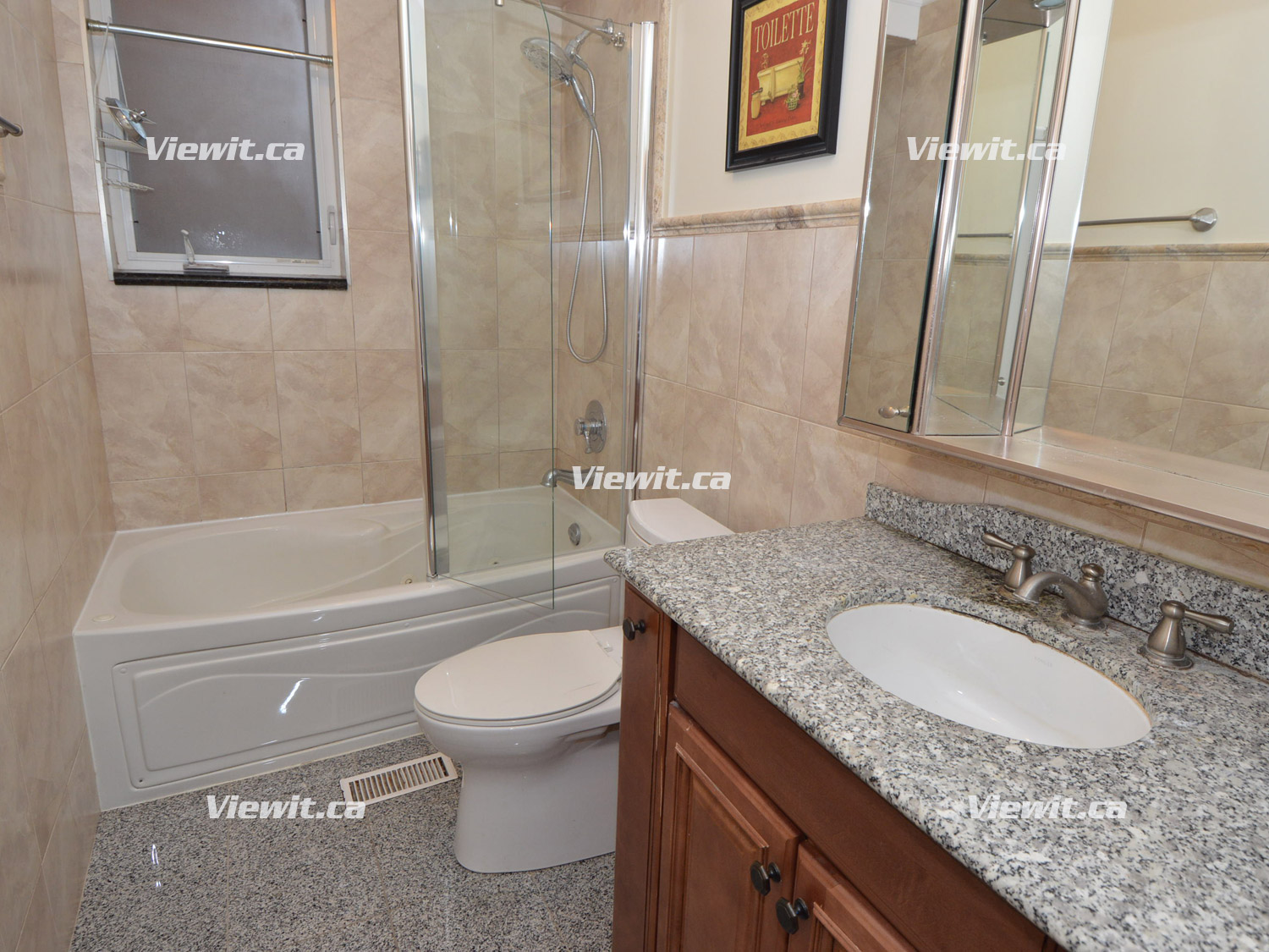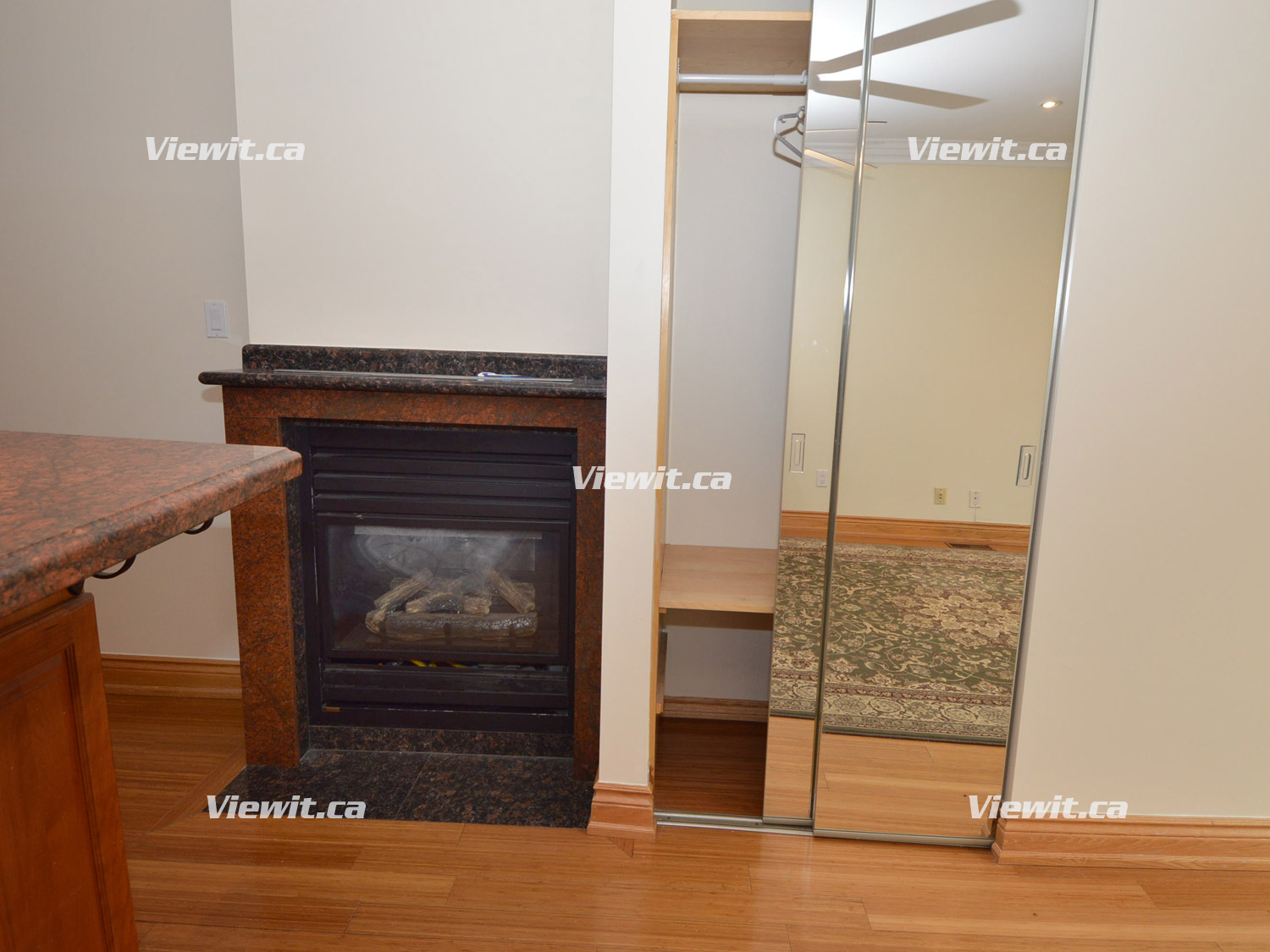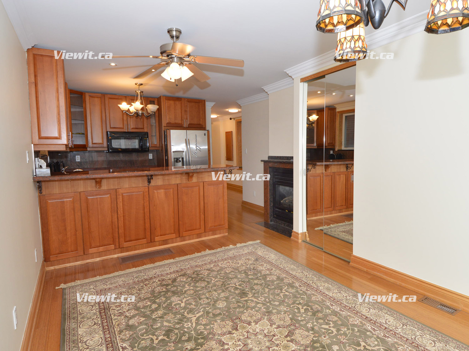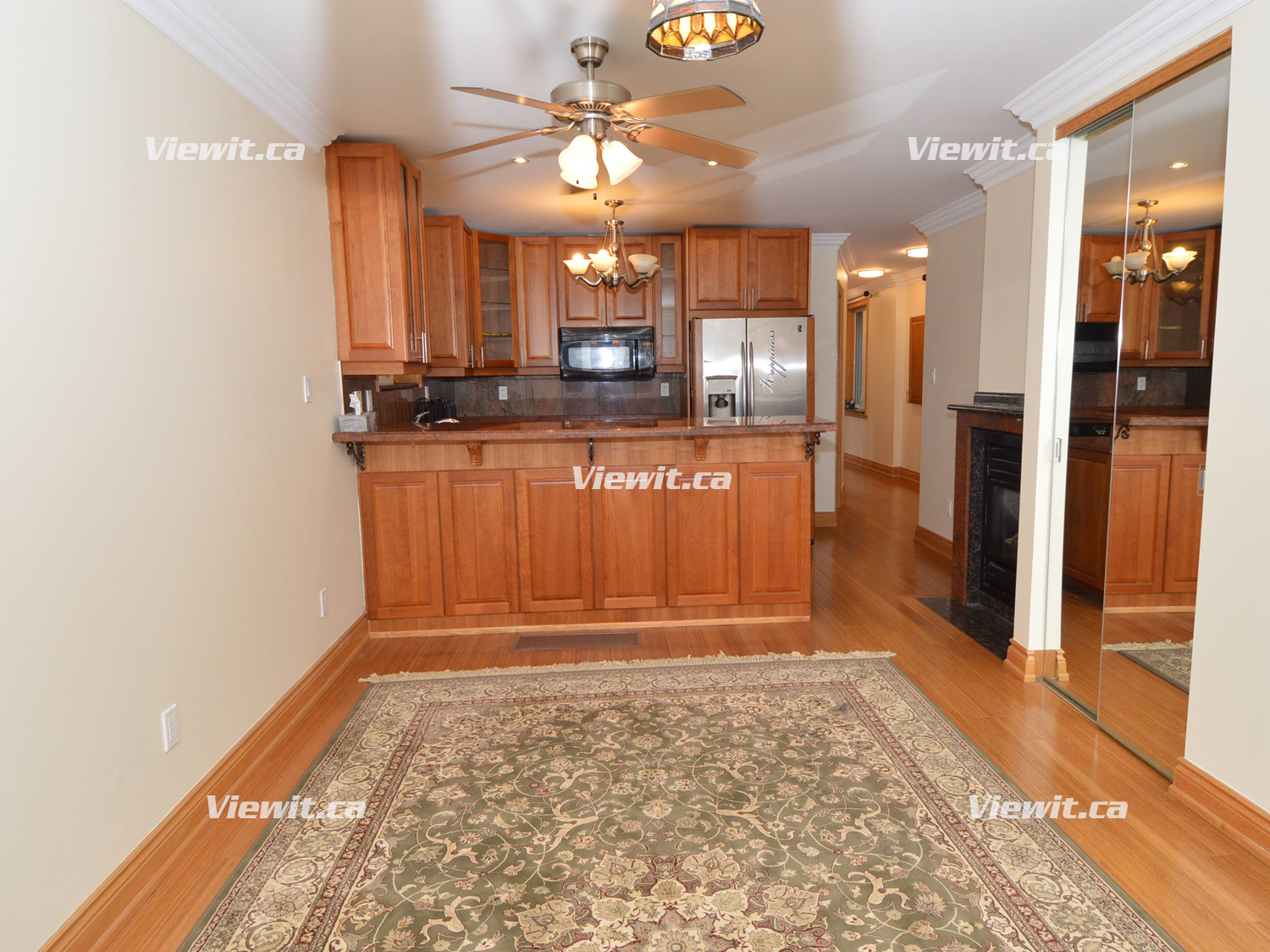 Open concept kitchen, living room area (granite gas fireplace). 1 full bathroom (includes whirlpool tub). Crown moldings, hardwood floors throughout, granite tiles, cherry wood cabinets in the kitchen and granite tiles in bathroom.