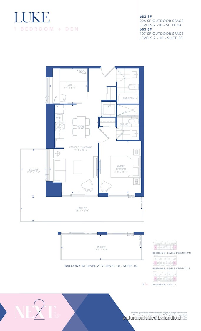 This brand new 1 Bedroom + Den / 2bathrooms condo (LUKE layout) is approximately 683 sq ft + 226 sq ft balcony and features 9 ft ceilings, functional and bright layout, modern integrated appliances, ensuite laundry and much more. Premium large den with a window and sliding doors ideal for an office or flex space. 2 full baths with a tub and a walk-in shower. SOUTH/WEST exposure.