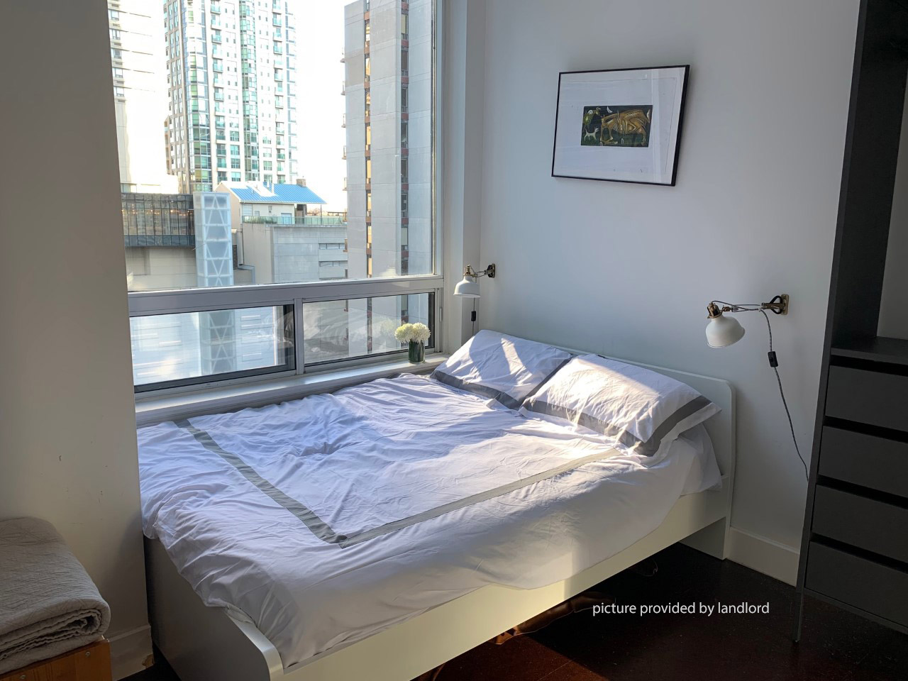 Option to include some furnishings (3 bar stools, couch, ottoman). Includes: heat, AC, building common elements, building insurance, water. Tenant pays hydro.