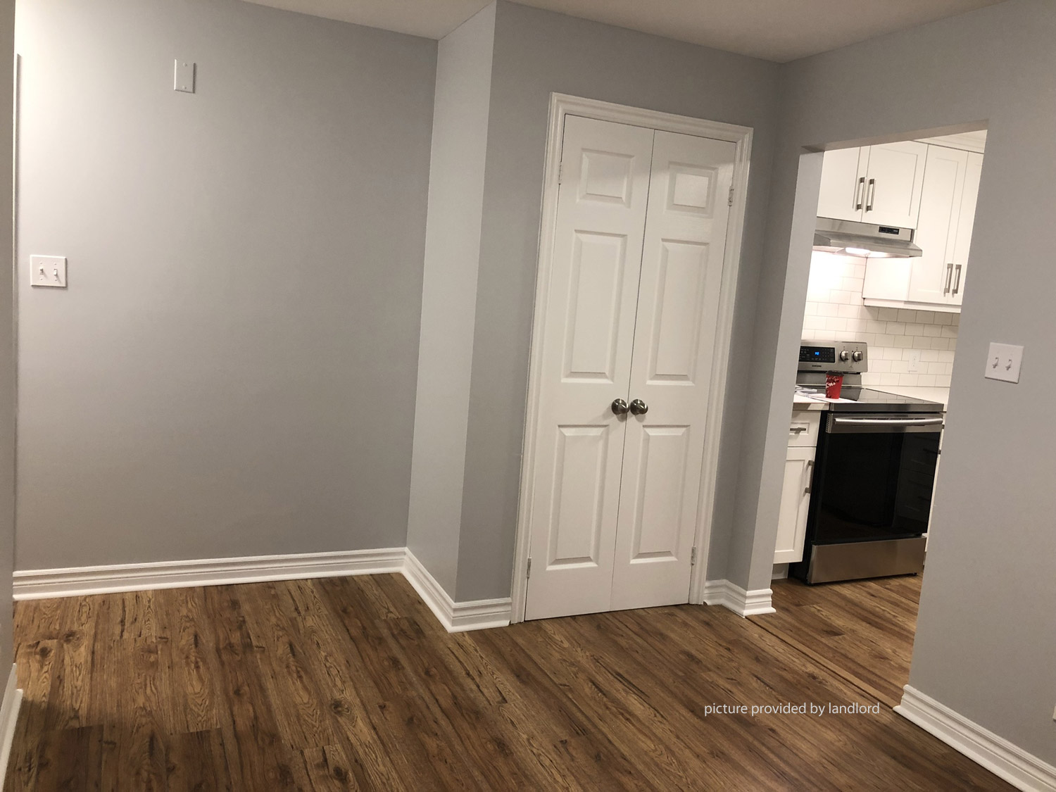 and oven, quartz counter top, bathroom, and laminate flooring.