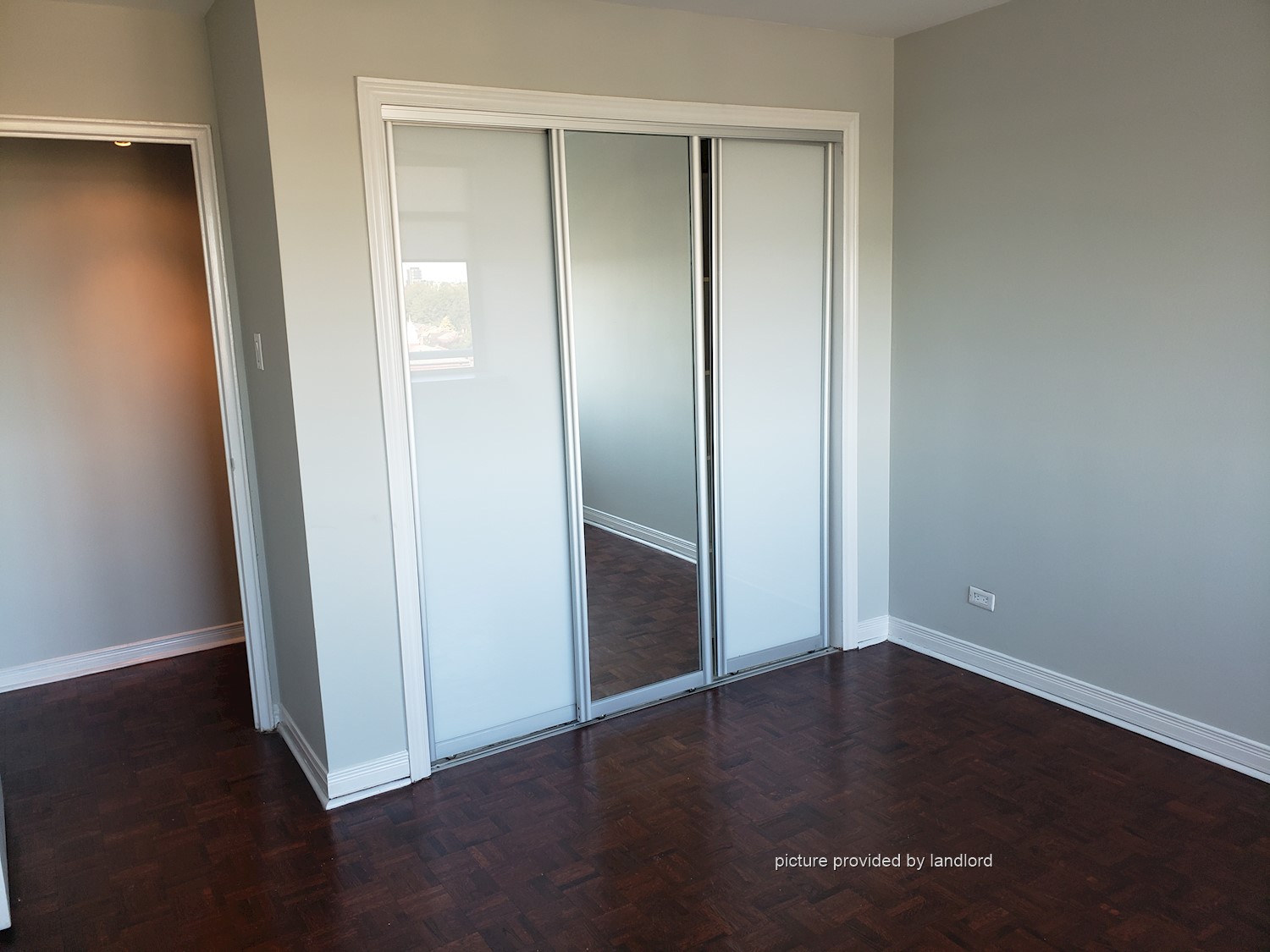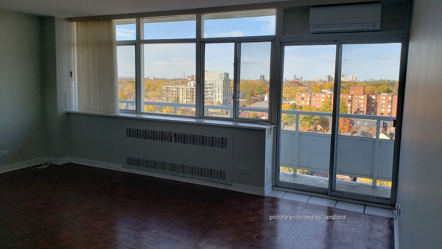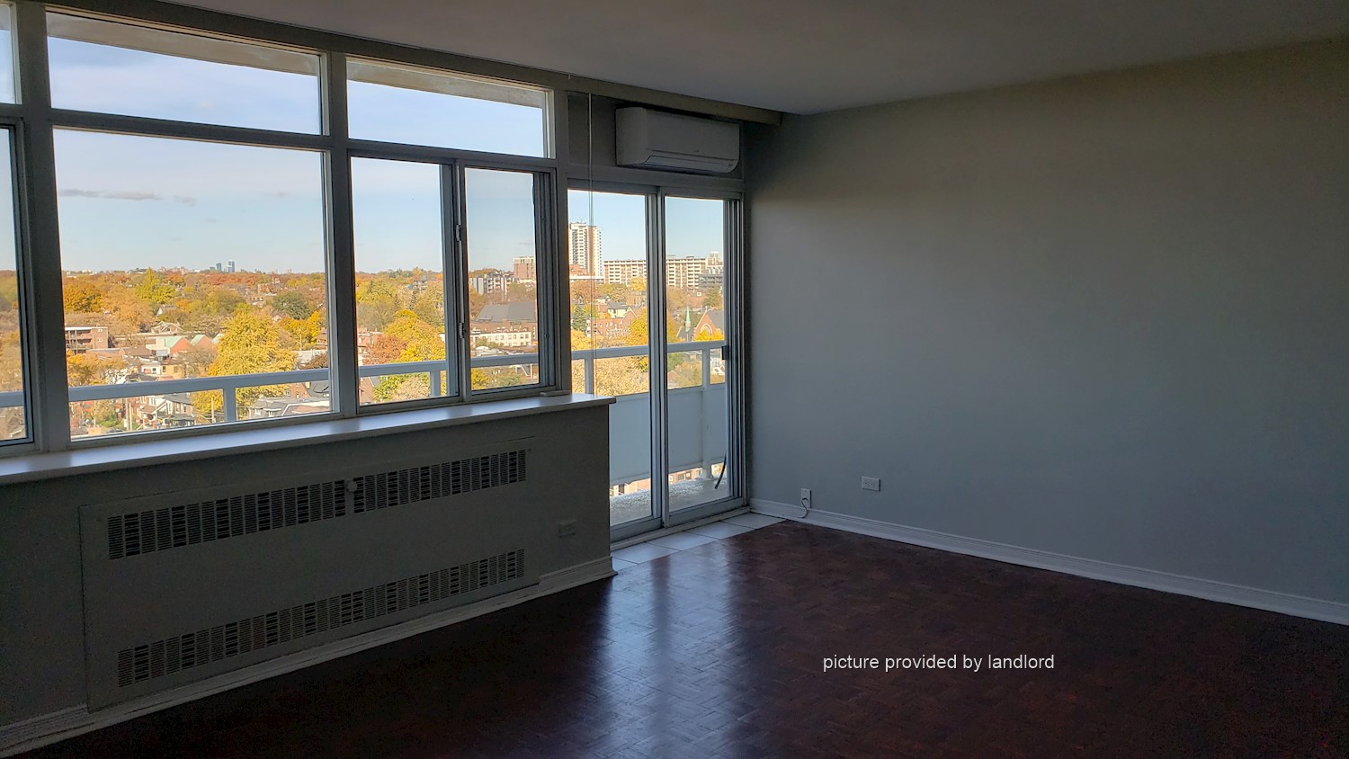 The space features parquet hardwood floors, large windows in the living room