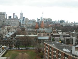 Unfurnished bachelor apartment with views overlooking the university campus and the Toronto skyline, approximately 430 square feet, features nightshades, sunshades and ensuite laundry.