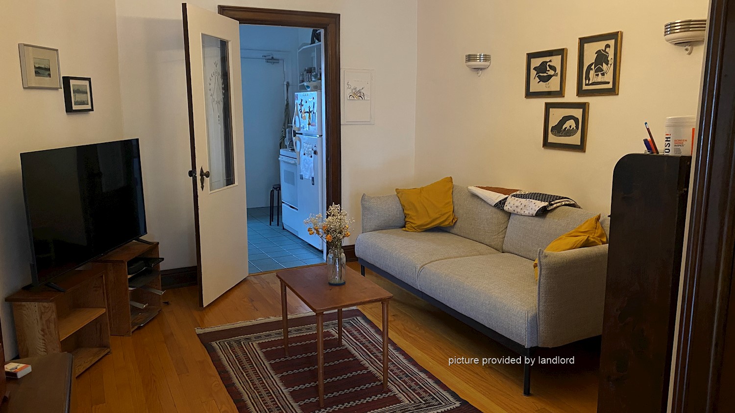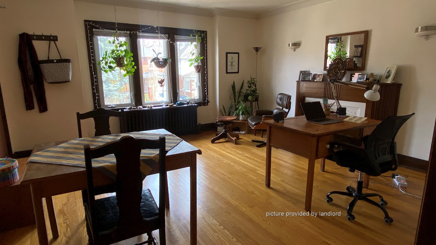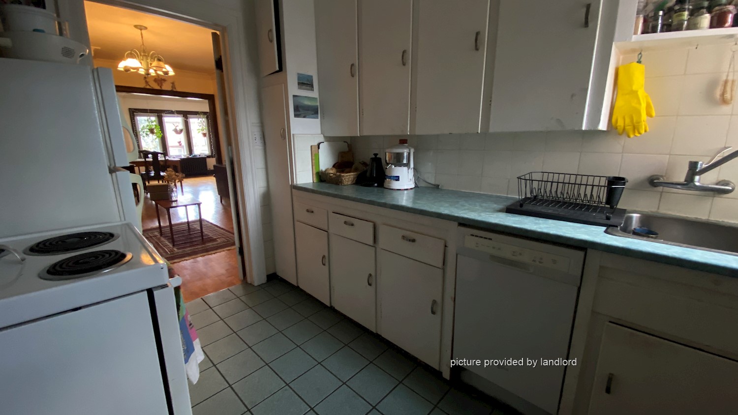 Layout: hardwood floors in separate living room with fireplace, separate dining room and separate kitchen with 3 appliances (fridge, stove and dishwasher).