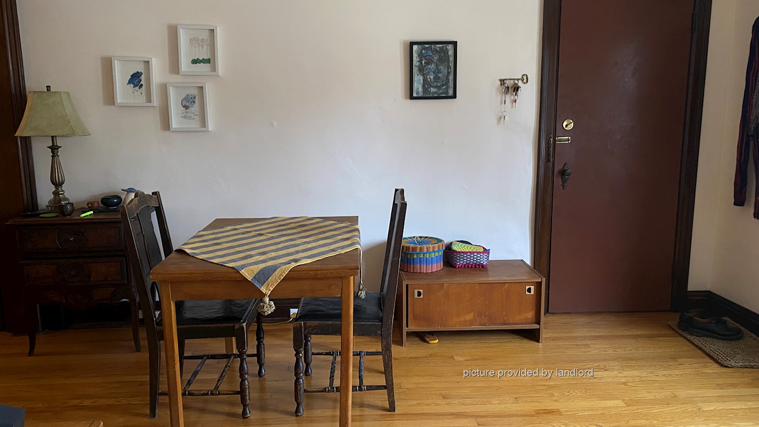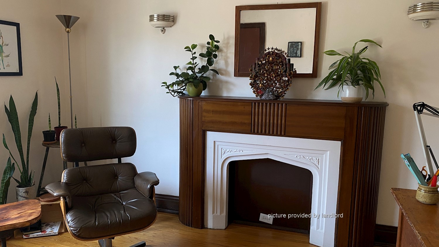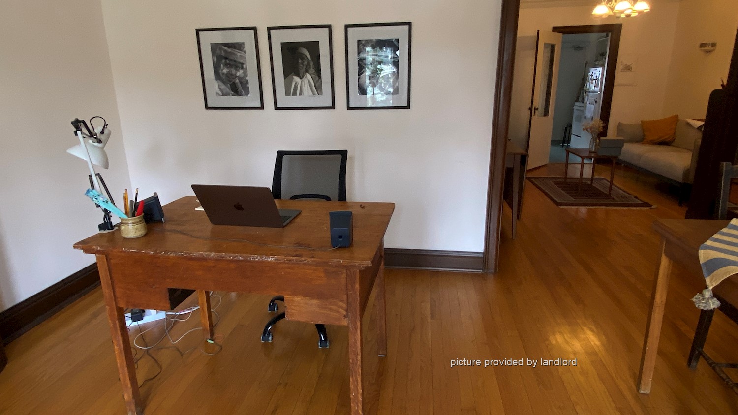 Layout: hardwood floors in separate living room with fireplace, separate dining room and separate kitchen with 3 appliances (fridge, stove and dishwasher).