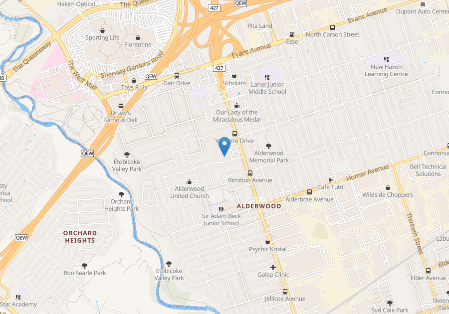 to TTC, GO Station, Sherway Gardens, QEW, Hwy [427], parks and trails.
