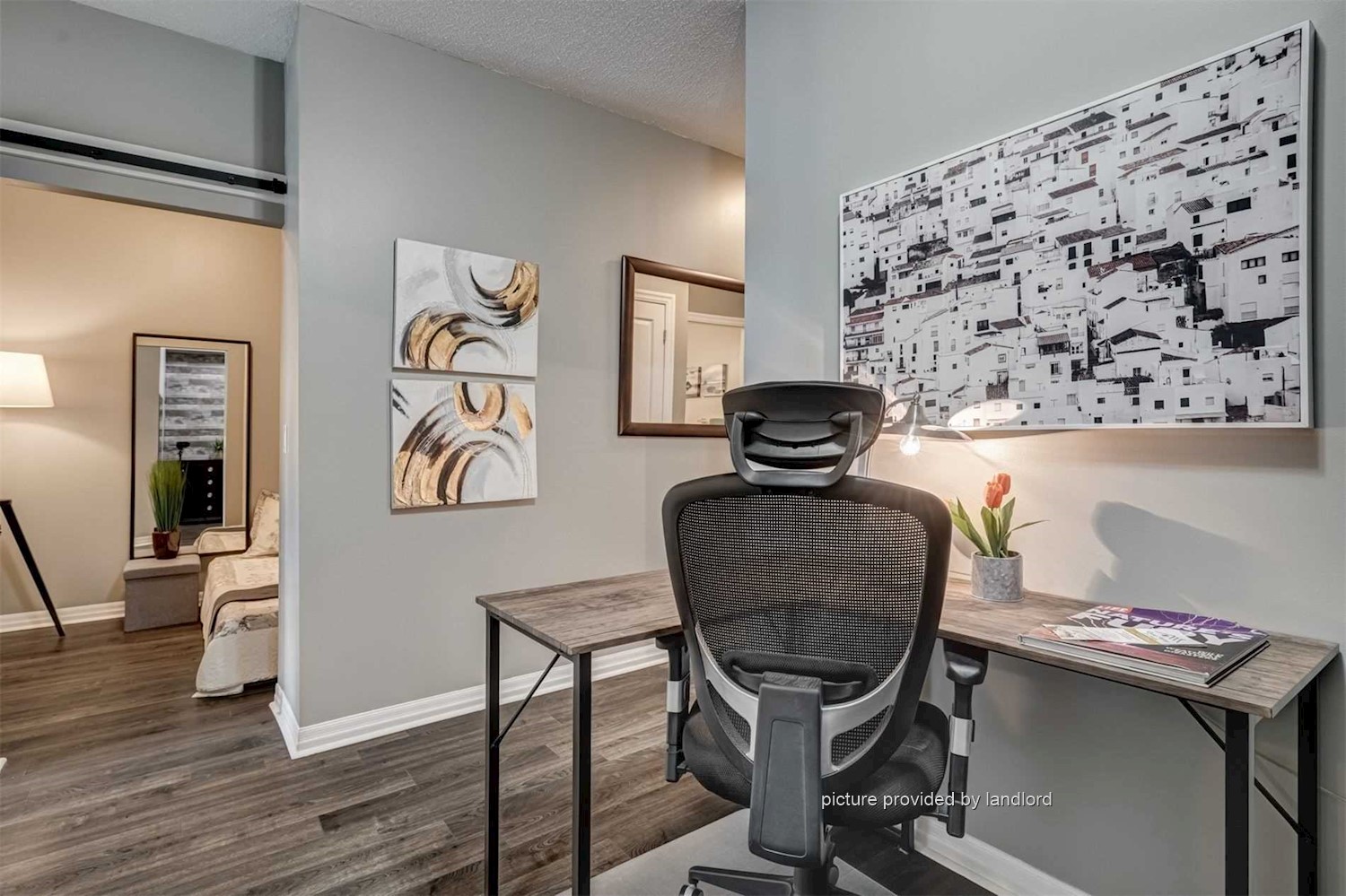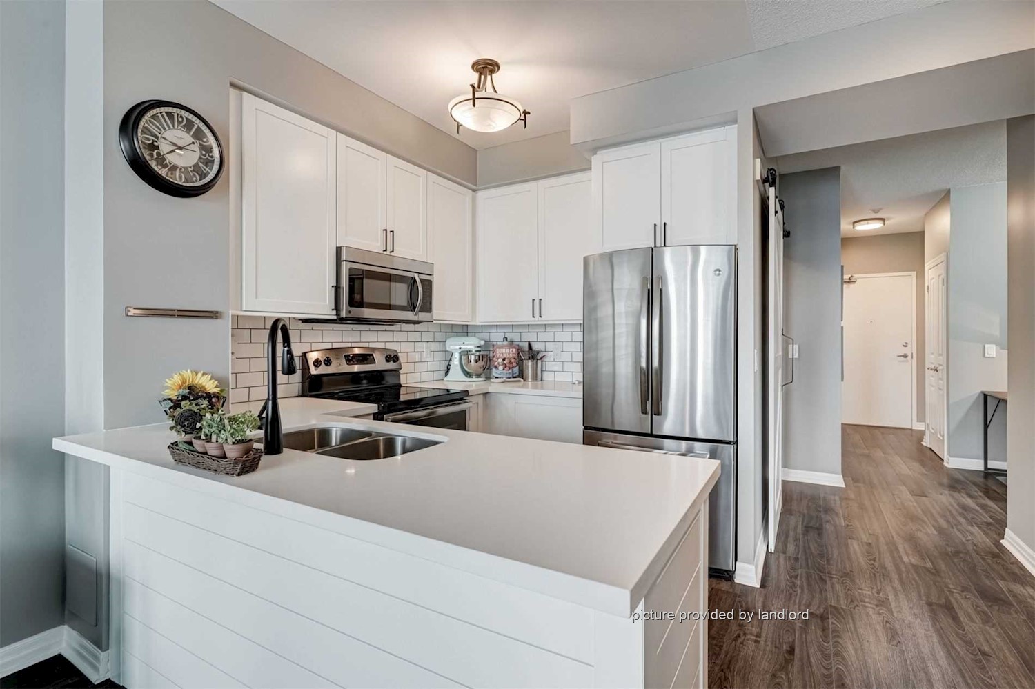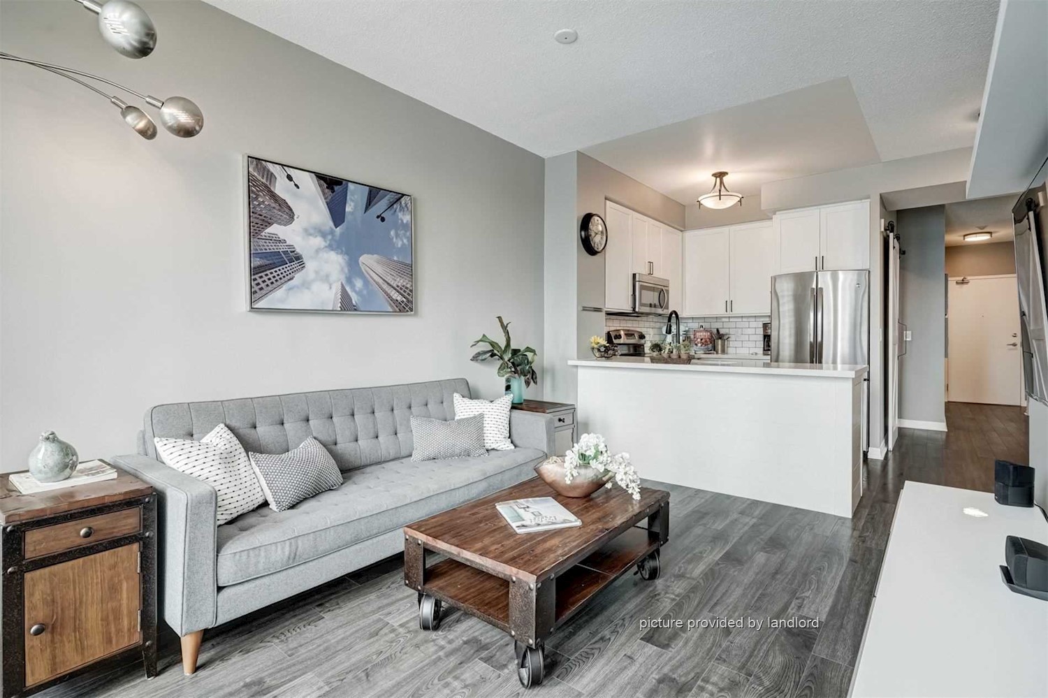 One den can be used as second bedroom which has sliding door, open-concept kitchen with quartz counters, stainless steel appliances, and 9-ft ceilings.