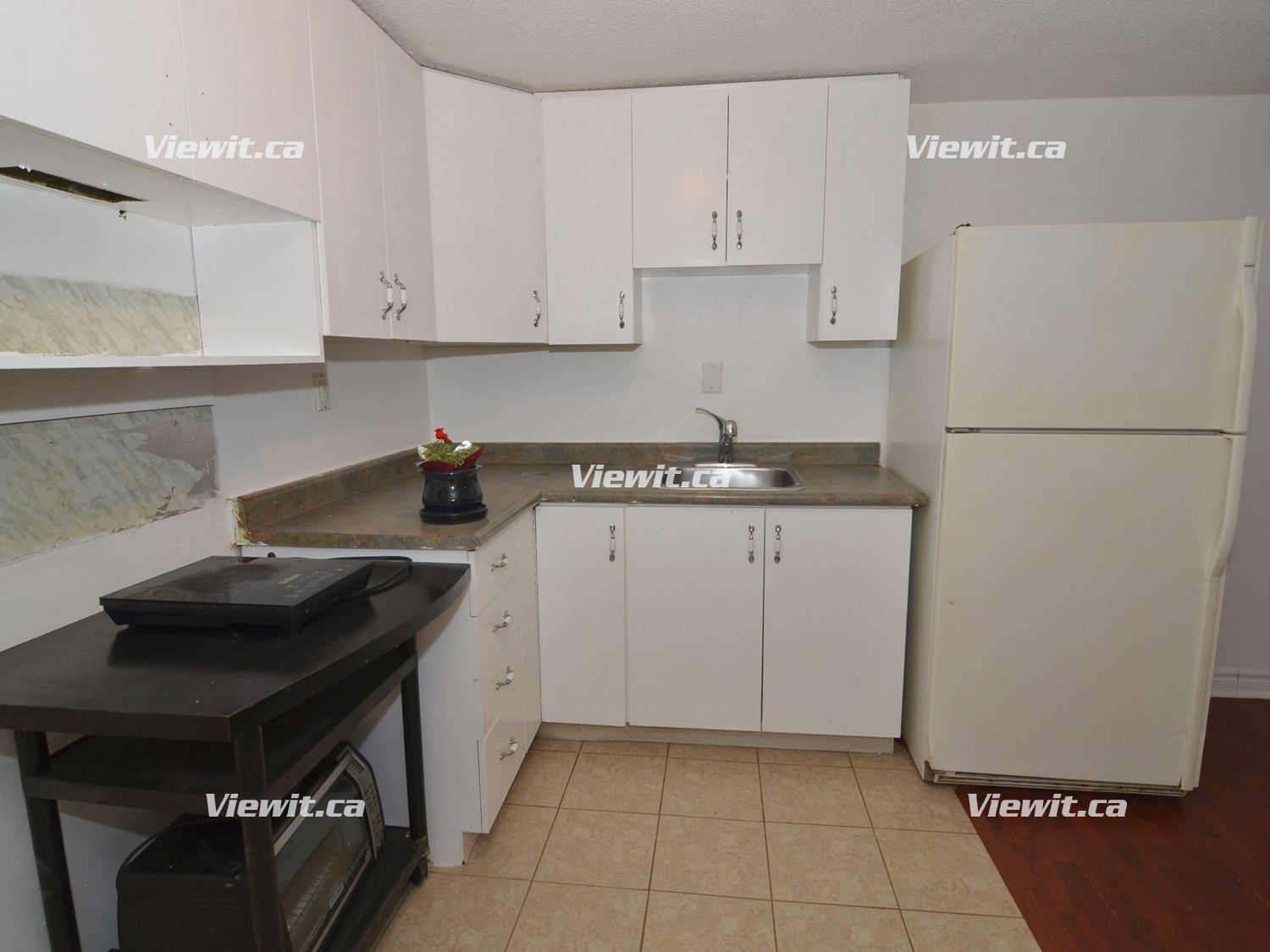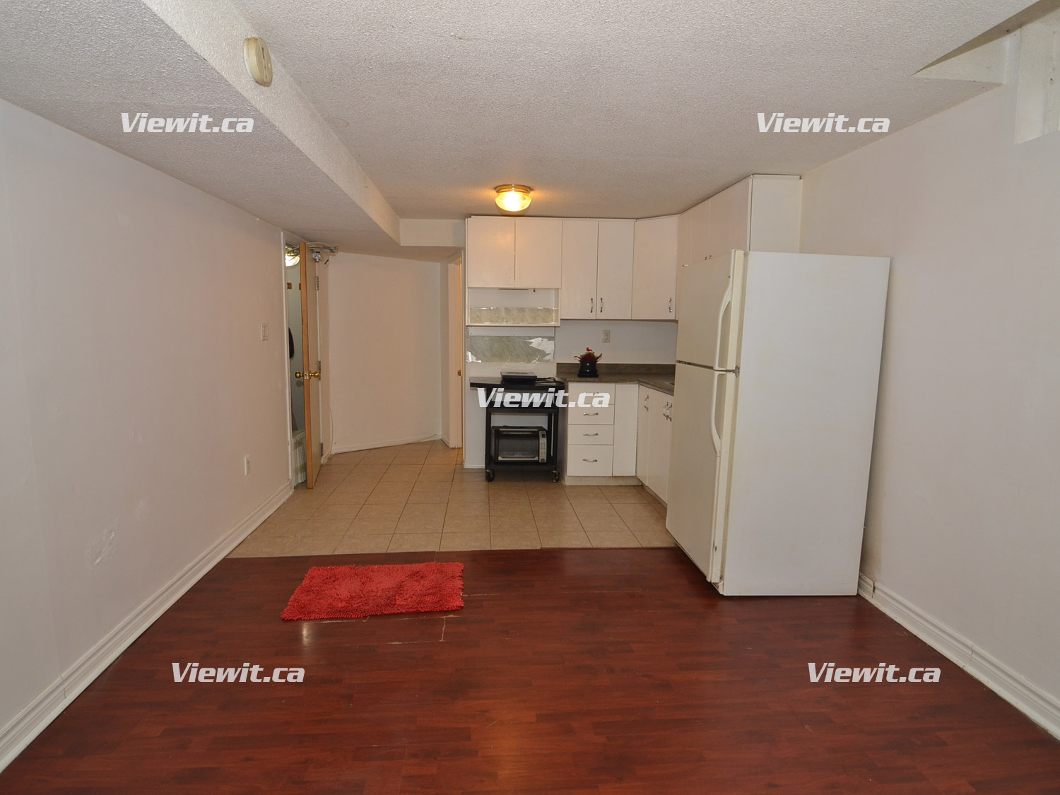 Kitchen-dining area, includes fridge, stove and ceramic tiles. Hardwood throughout living room area. One 4-piece bathroom. Parking included and laundry on-site.