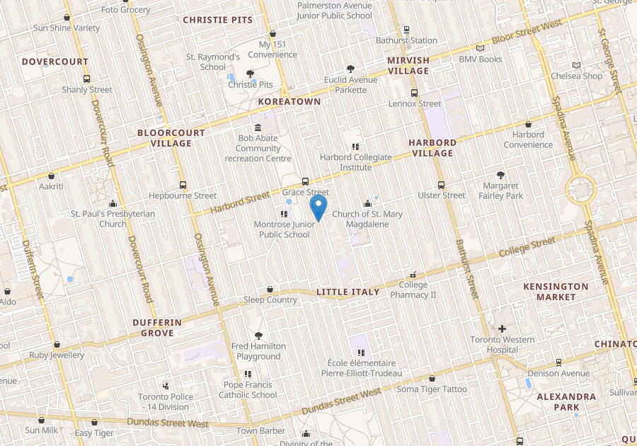 Great neighbourhood, located between Harbord St., and College St. (on Grace St.). Close to all amenities; Little Italy, shops, restaurants-eateries-cafes, groceries and U of T campus. Very close to the downtown core.