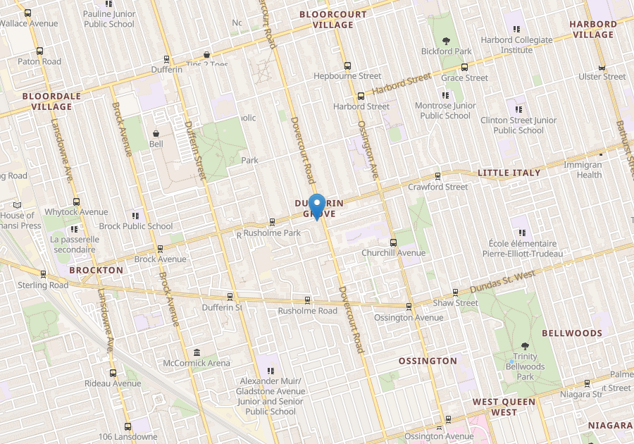 Located on Dovercourt Rd. just off of College St.; so it's a stone's throw away from the West End YMCA, laundromat, dry cleaner, steps from all the action of Little Italy, activities at Dufferin Grove Park, trendy Ossington and prestigious U of T. Close to all modes of transportation.