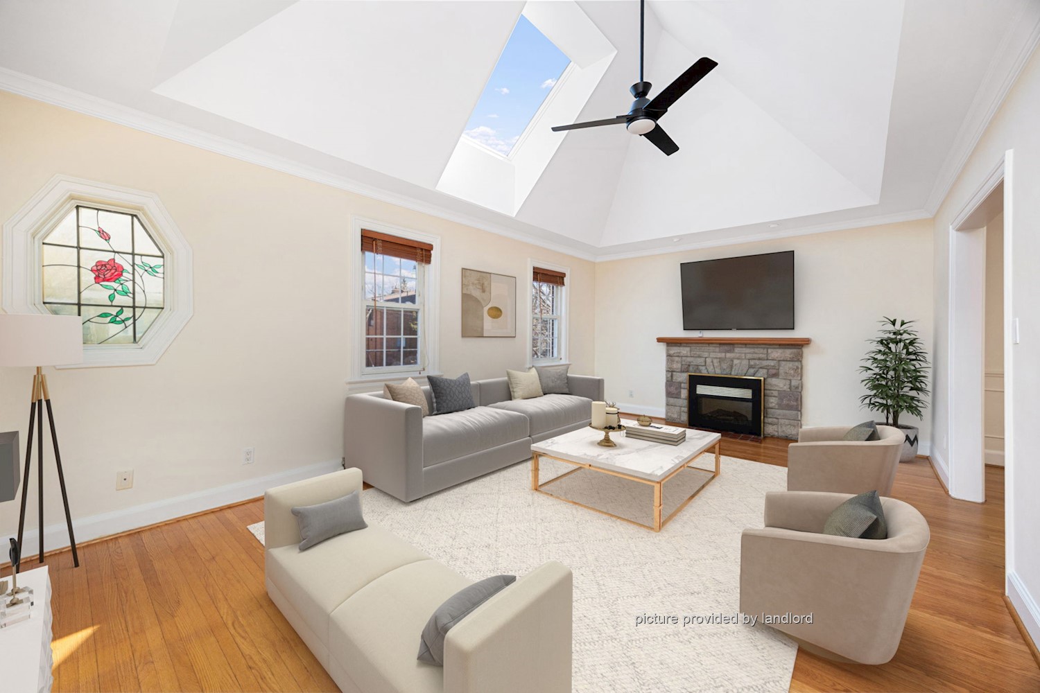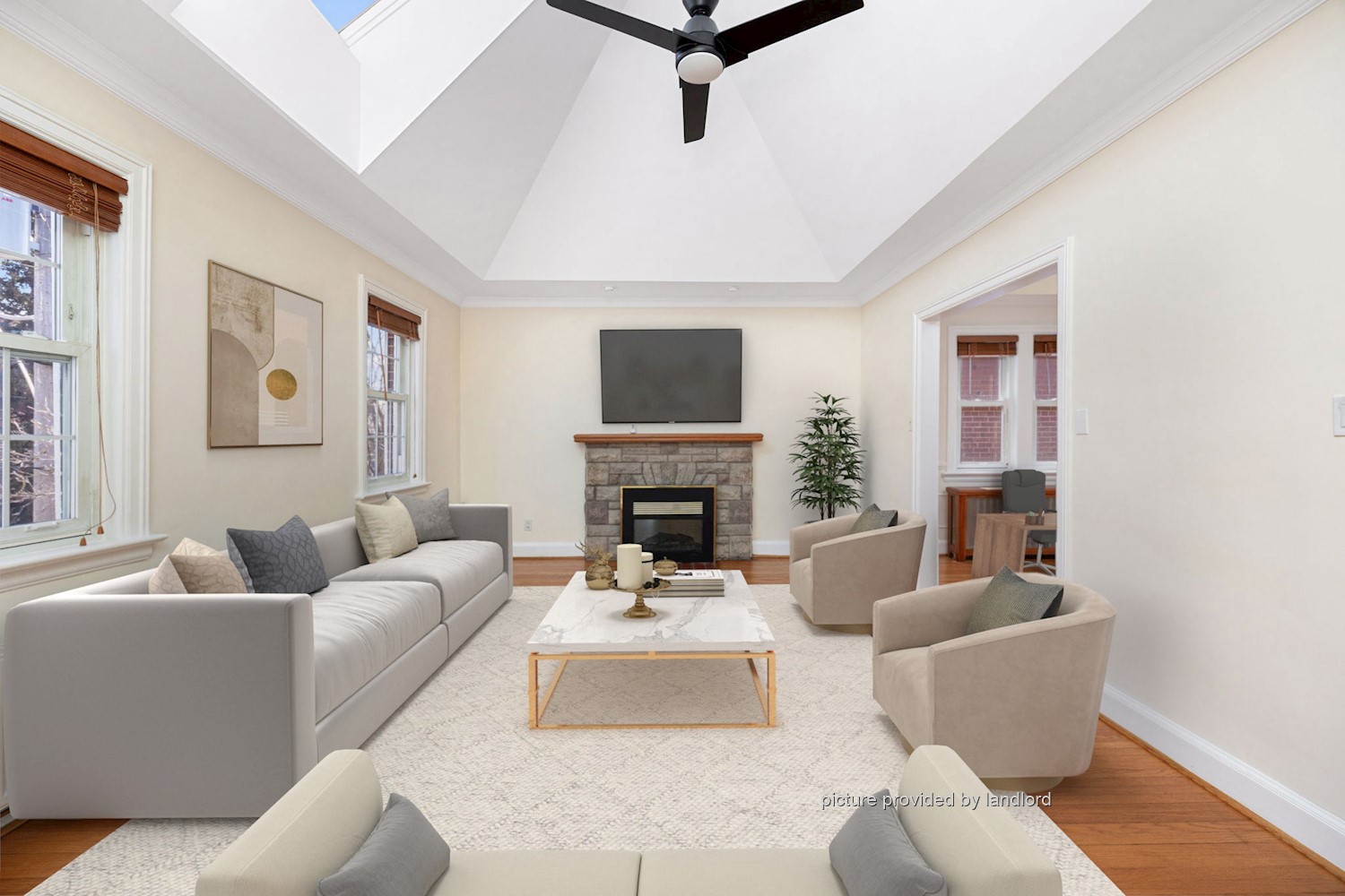 A formal dining room with a cozy fireplace creates the perfect setting for dinners and gatherings. The bay-windowed living room offers a warm, inviting space to unwind.