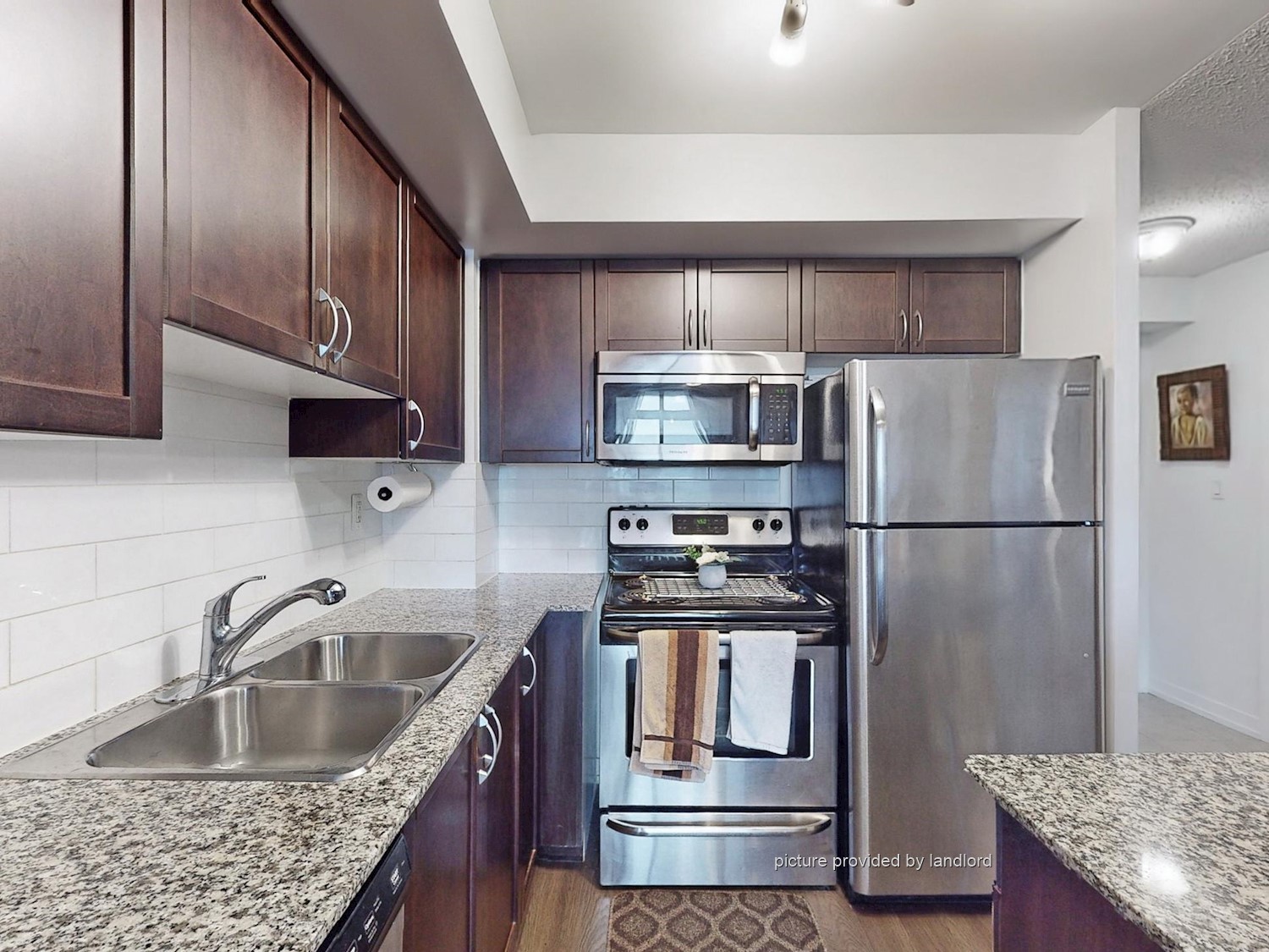 kitchen with island + full-size stainless steel appliances