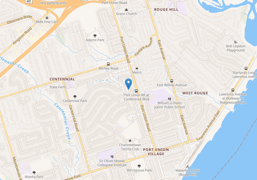 located in Scarborough, specifically in the Port Union/Centennial