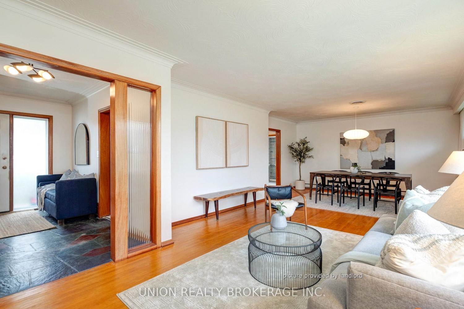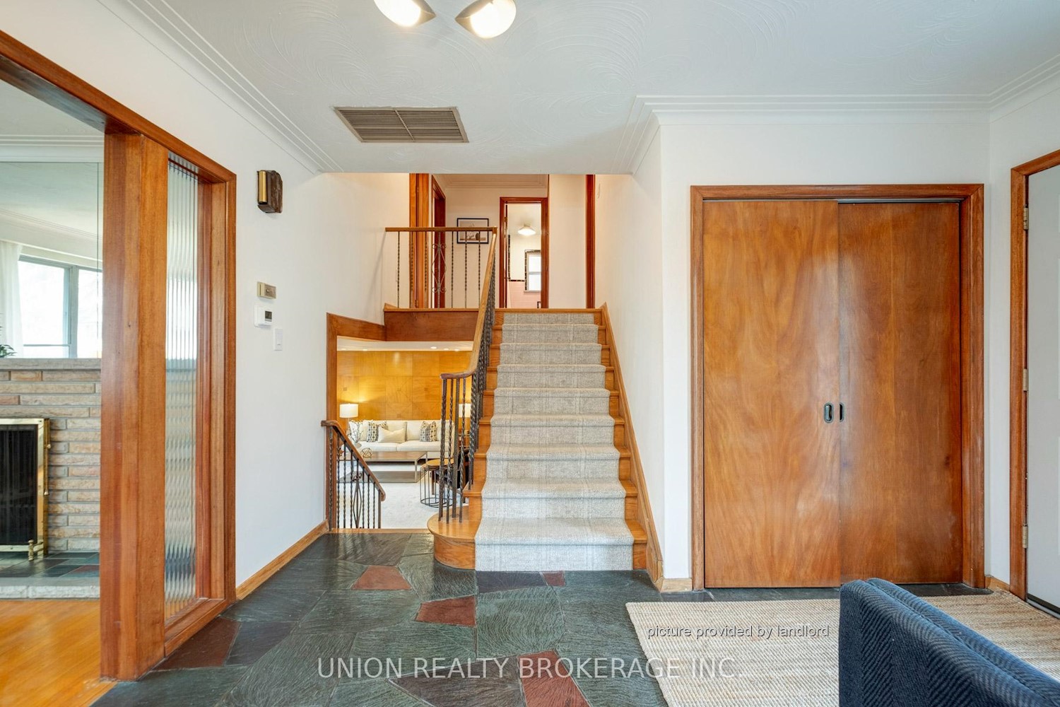 A slate-tiled foyer welcomes you into a spacious living room with a central