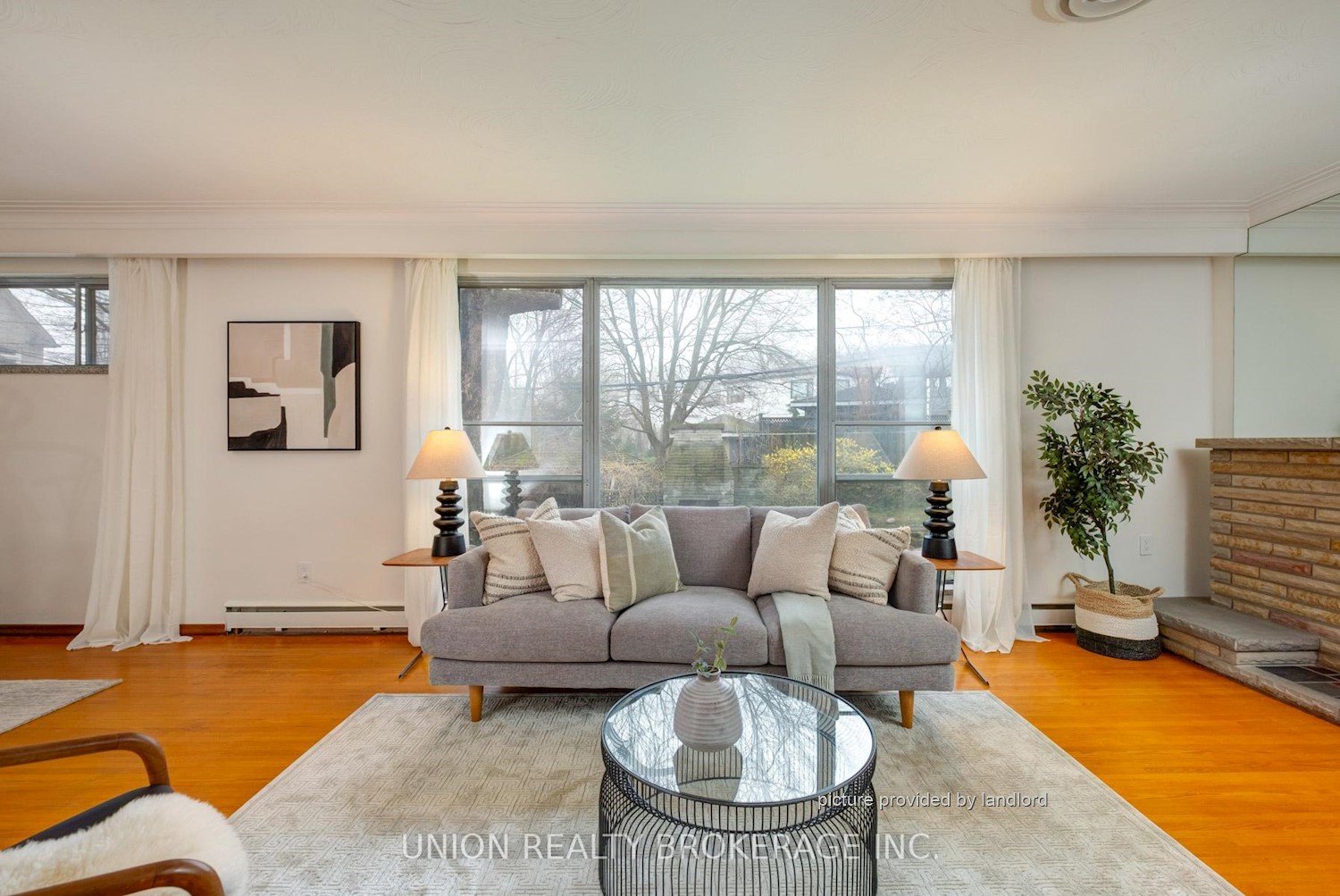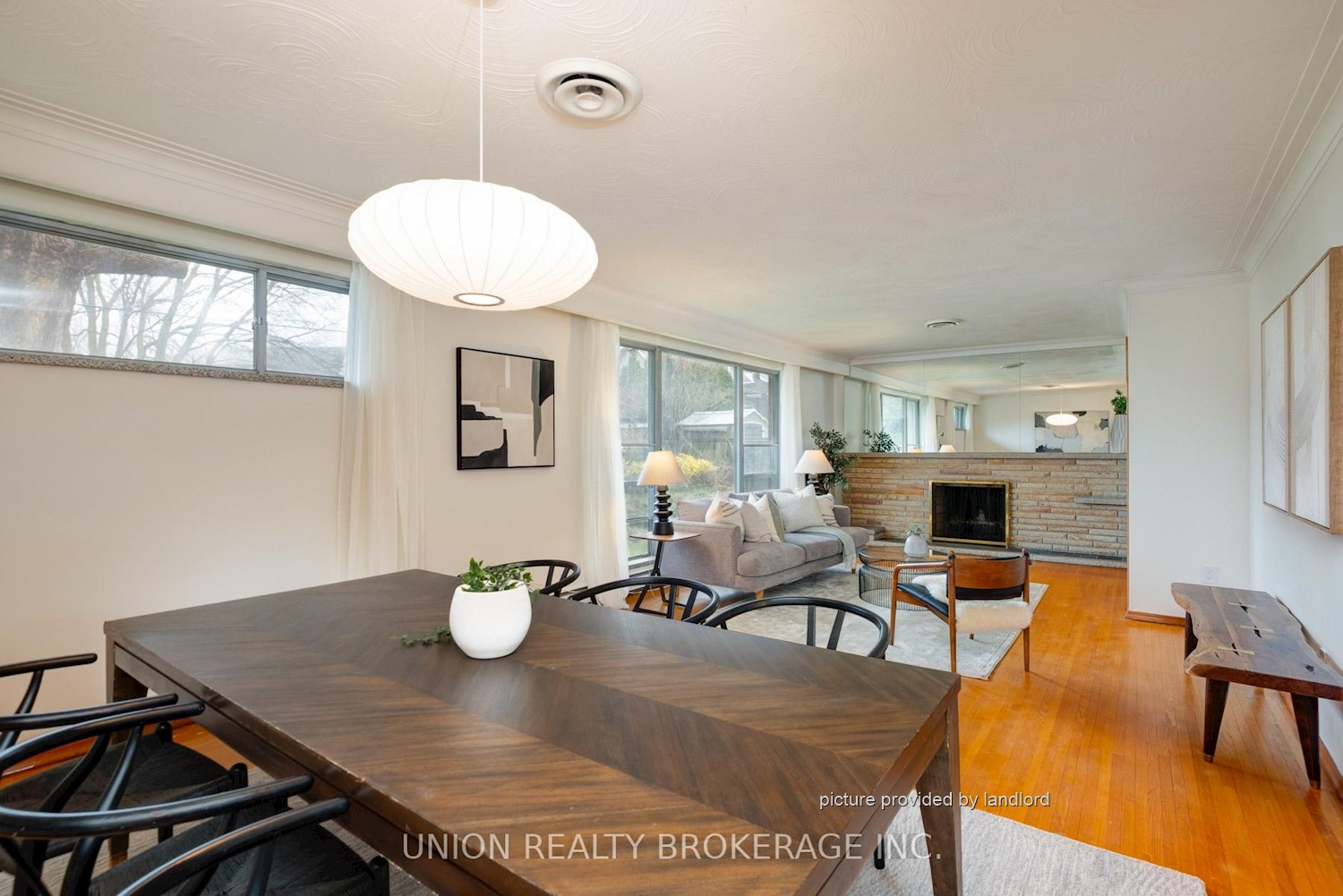 room with a brick fireplace, or entertain in the bright, open living and dining