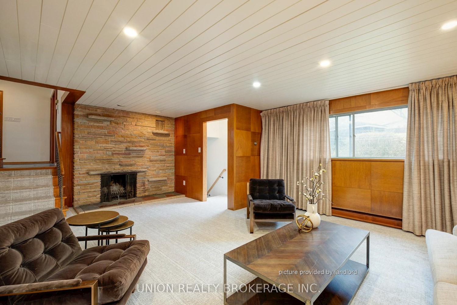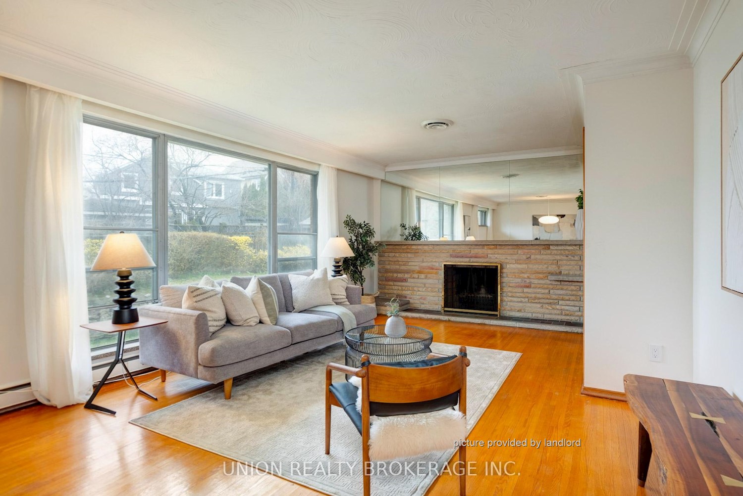 fireplace, and illuminated by a large window overlooking the private backyard.