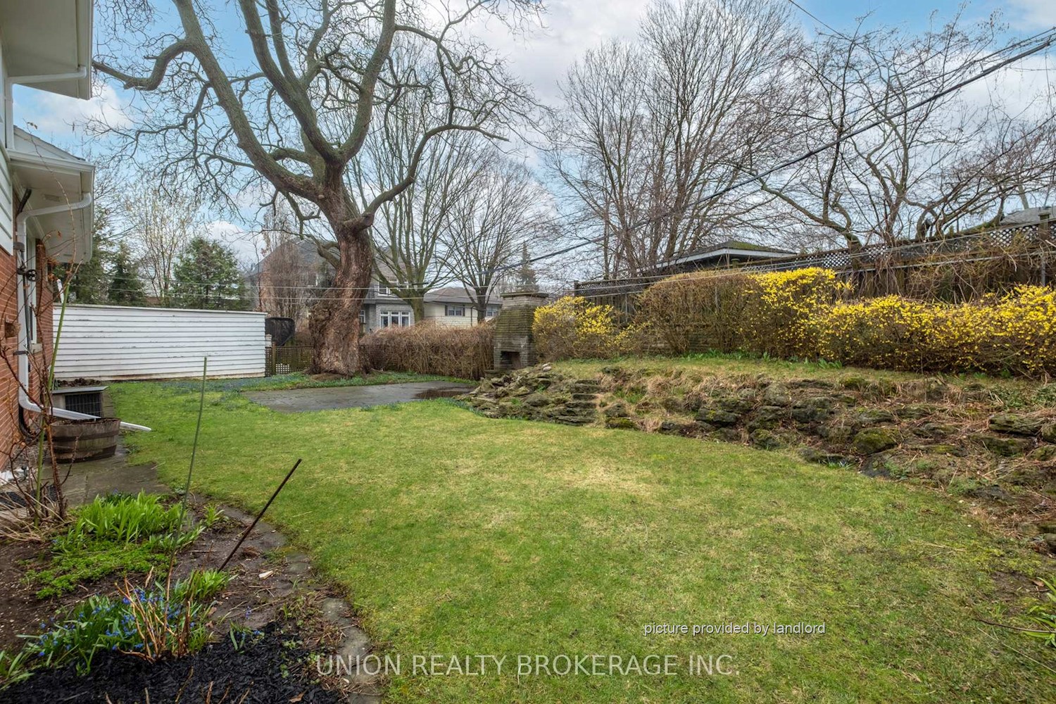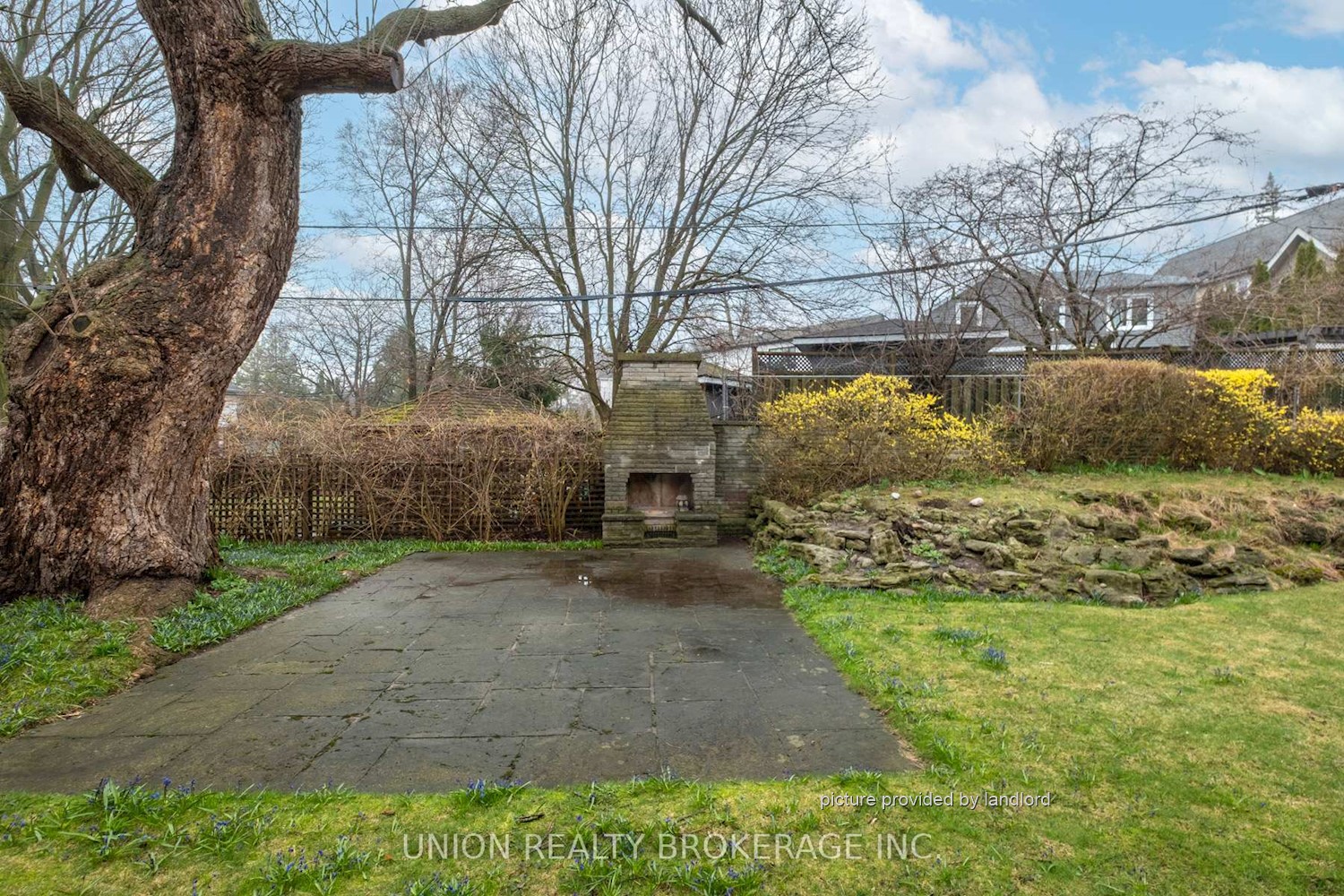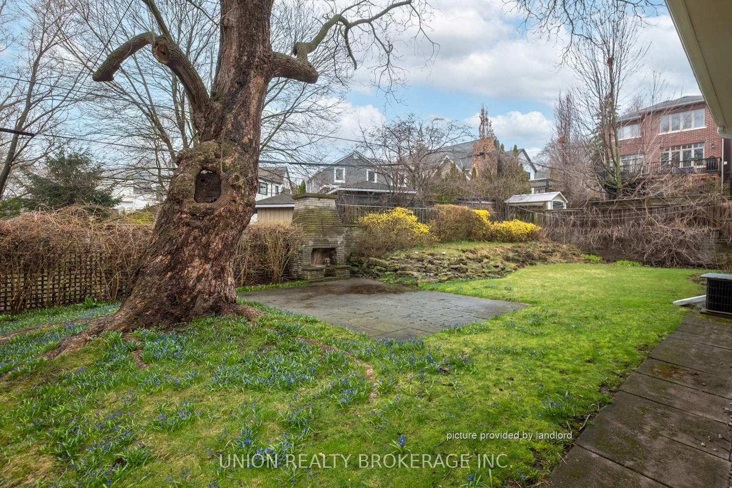 areas overlooking the expansive backyard, also with a brick fireplace. A