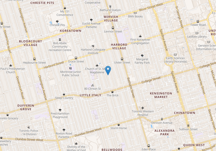 Located on Manning north of College St. Close to great restaurants and cafes on College Street. College Street car a 1 minute walk. Metro located at College and Shaw St.