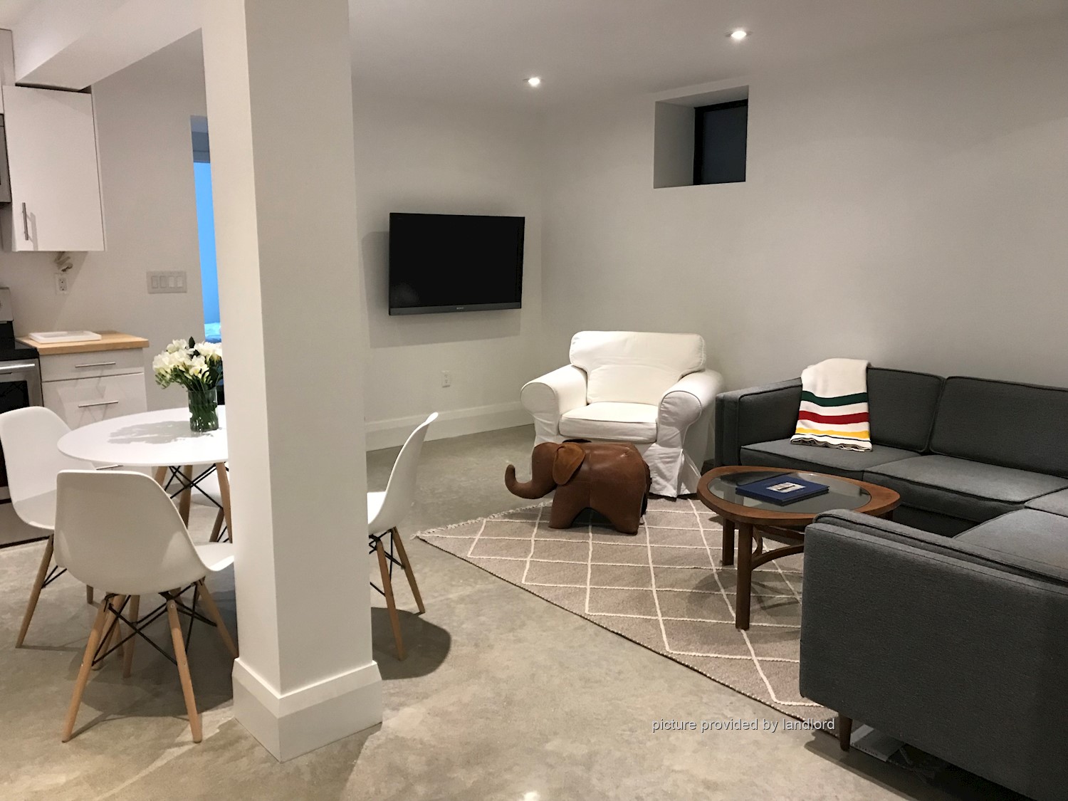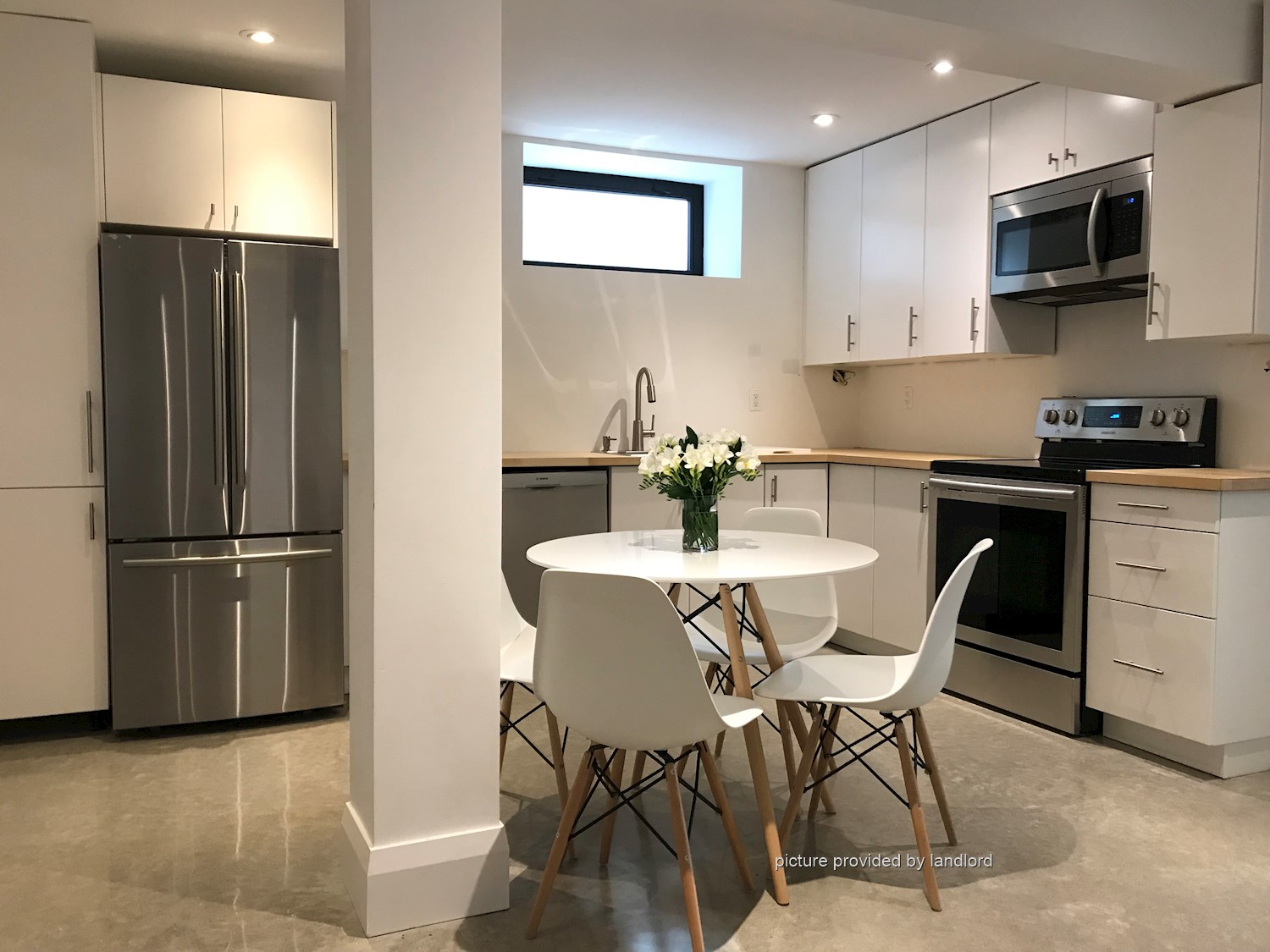 Bright 2 Bedroom lower level apartment. Polished, heated concrete floors, 8'