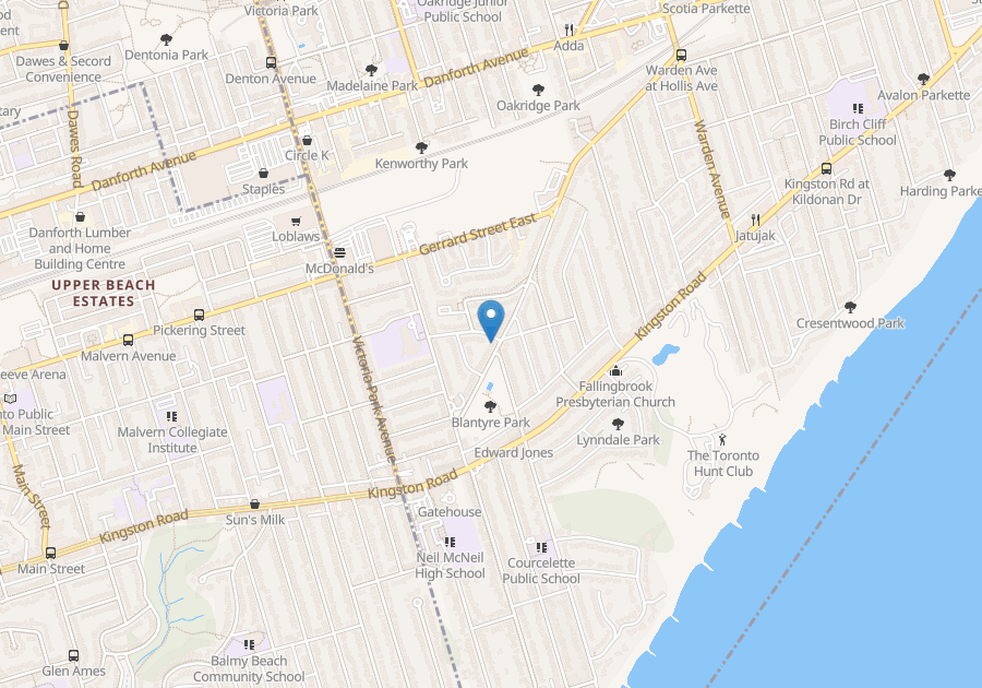 Spacious, clean 2 bedroom, 1 bath of main floor detached house that is unfurnished. Very large private rear yard, and enormous deck that is perfect for summer BBQs and entertaining. Open concept family room and kitchen, with lots of windows, and a skylight. Granite counter top in the kitchen, with stainless steel appliances, including a dishwasher, and washer and dryer. There are two entrances to the rear deck, from both bedrooms. Hardwood and ceramics throughout the house, no carpet. Great, safe location with a 2 minute walk from Blantyre Park, and a 15 minute walk to the beach. Parking for up to two cars + overnight street parking. Private laundry. Non-smokers only. Small pets OK. Available May 1st. $2400/month plus utilities. Credit check required. Please call Jag 647.982.1763.
