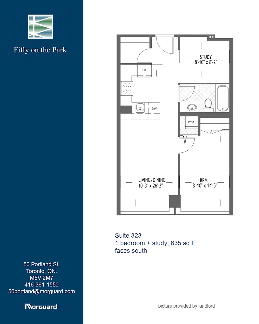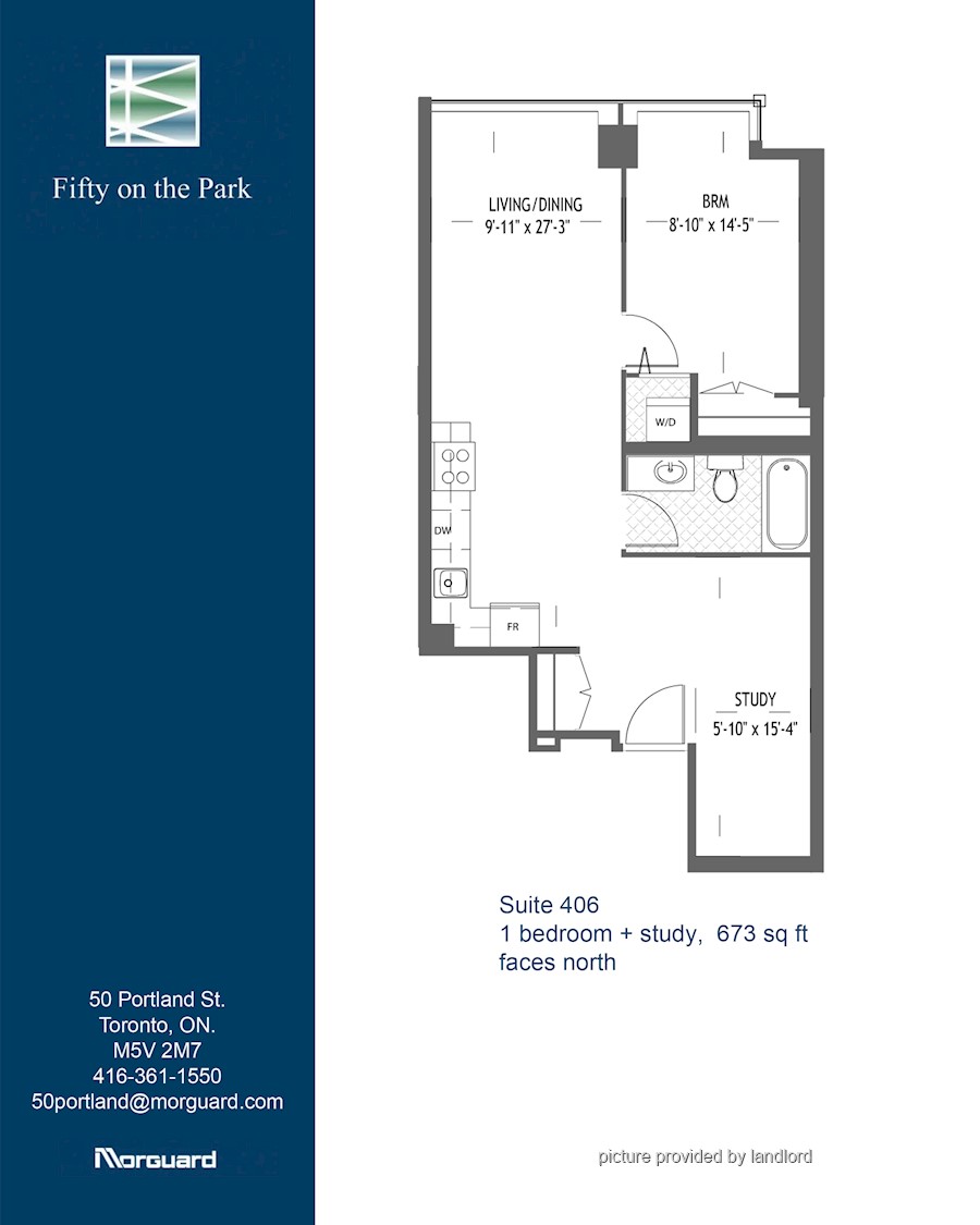 1 bdrm +den 1 bath, 5 appliances, granite counter tops, ensuite laundry. Amenities include: roof top terrace with BBQs, East courtyard with BBQ, Fitness center, Pet spa, Games/ party room. Parking available for an additional fee.