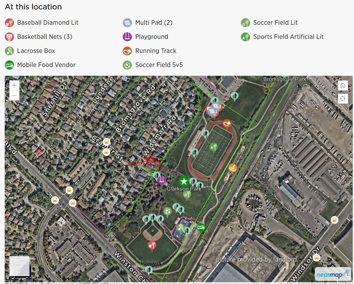 at corner. Property backs onto Clarkson park with soccer field, 3 basketball