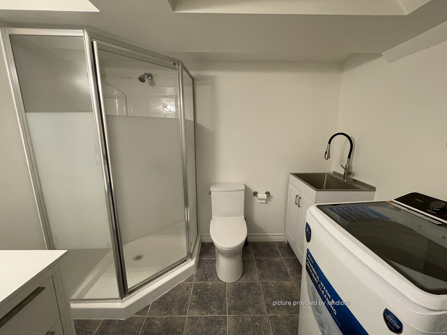 Spacious bathroom with all new fixtures including vanity, shower, toilet and