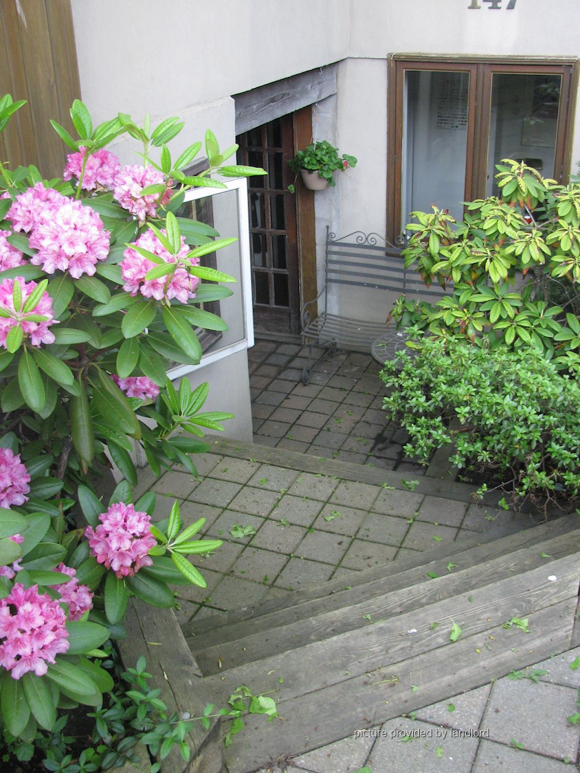 Basement entrance shares a common patio with outdoor bench and a little table for your morning coffee.